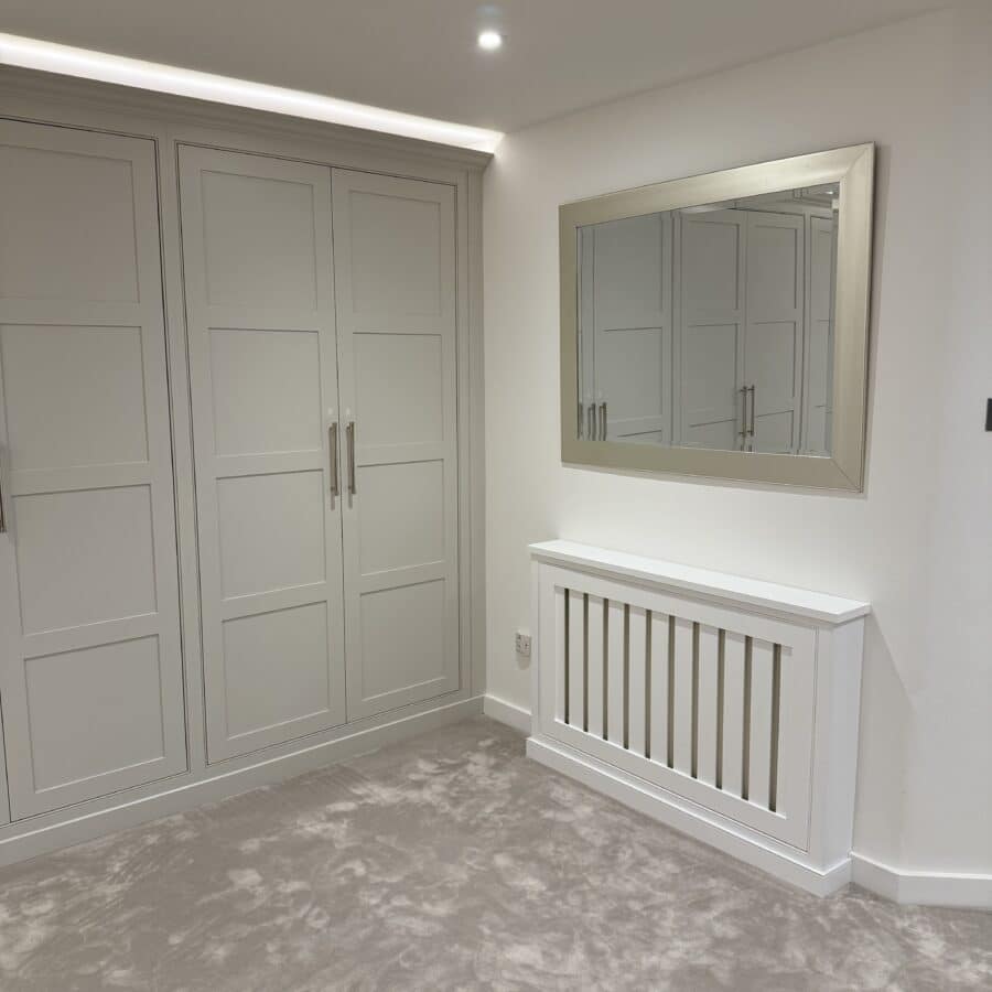 On the right-hand side, classic shaker-style doors provide discreet, practical storage for larger and less display-worthy items such as luggage, bedding, and additional hanging. This ensures that everything has its place, without compromising the visual elegance of the room.